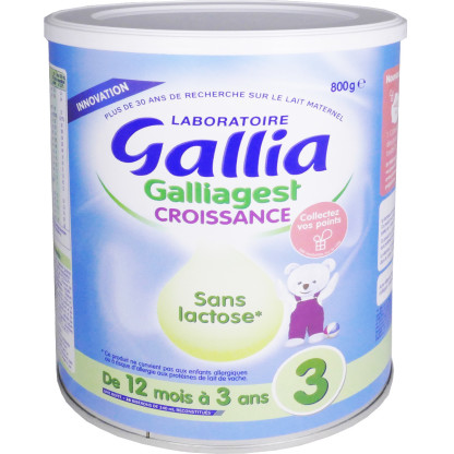 GALLIA spécialiste du lait infantile depuis 60 ans, développe en collaboration avec des spécialistes de la petite enfance (pédiatres, nutritionnistes…) une large gamme de laits infantiles se rapprochant au mieux du lait maternel, pour offrir aux bébés une alimentation adaptée à leur développement, prévenir ou traiter les petits troubles nutritionnels des nourrissons. GALLIAGEST croissance Sans lactose de GALLIA est spécialement formulé pour l’alimentation des nourrissons de 12 à 36 mois présentant une intolérance au lactose. Ce lait très contribue à la croissance harmonieuse du nourrisson en évitant toute réaction allergique.