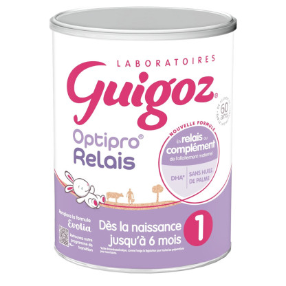 Guigoz 1 Optipro Relais est un lait en poudre qui permet aux bébés de passer du lait maternel au biberon tout en douceur, et également de favoriser le bon développement du bébé en apportant tous les nutriments nécessaires : taux de protéines ajustées, fer, vitamines, minéraux, acides docosahexaénoïque (DHA) un acide gras de la famille des oméga 3. Avec ce lait sans huile de palme, le système immunitaire sera renforcé, les bébés grandiront harmonieusement et accepteront les biberons facilement comme le sein de la maman