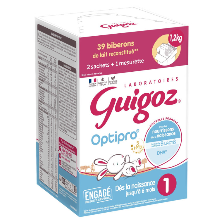 Le lait 1er âge Optipro de Guigoz est spécialement formulé pour apporter tous les éléments nutritifs essentiels à la croissance des bébés de 0 à 6 mois qui ne présentent pas de problèmes digestifs particuliers. Ce lait apporte des protéines en dose suffisante pour ne pas surcharger l’organisme des nourrissons, du fer, des vitamines, des minéraux, des acides gras polyinsaturés à chaînes longues (AGPI-CL), et du DHA de la famille des Oméga 3 qui favorise le développement normal neurosensoriel des tout-petits. L'OMS recommande l'allaitement au sein pendant les six premiers mois suivant la naissance.