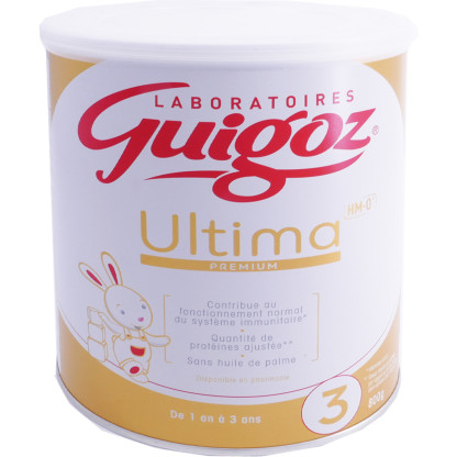 Depuis plus d’un siècle, GUIGOZ accompagne le développement harmonieux des bébés et la sérénité de leur maman en proposant des laits infantiles de qualité, conçus pour apporter une réponse adaptée à tous les besoins nutritionnels et/ou digestifs des tout-petits. GUIGOZ ULTIMA Premium est formulé sans huile de palme et apporte tous les éléments nutritifs pour compléter les apports de la diversification alimentaire chez votre bébé. GUIGOZ ULTIMA PREMIUM contribue à la croissance des bébés des 1 an à 3 ans (vitamines, Omega 3, protéines ajustée), contribue au développement normal du cerveau mais veille aussi au bon fonctionnement du système immunitaire grâce aux vitamines A, C, D au Zinc et au Fer.