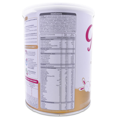 LACTOSE, huiles végétales (tournesol riche en acide oléique, colza, tournesol), protéines de LACTOSERUM partiellement hydrolysées, minéraux (chlorures de magnésium, de calcium, de potassium et de sodium ; glycérophosphate de calcium ; phosphate de calcium ; citrate de potassium ; sulfates ferreux, de zinc, de cuivre et de manganèse ; iodure de potassium ; sélénate de sodium), mélange 2'-Fucosyllactose / Difucosyllactose (1), Lacto-N-Tétraose (1), sel de sodium de 6'-Sialyllactose (1), sel de sodium de 3'-Sialyllactose (1), huile de POISSON, huile de Mortierella alpina, vitamines (A, thiamine, riboflavine, niacine, acide pantothénique, B6, biotine, acide folique, B12, C, D, E, K), bitartrate de choline, L-Arginine, L-Histidine, L-Tyrosine, Inositol, Taurine, L-Carnitine, culture de L. reuteri DSM17938*, nucléotides, antioxydants (extrait riche en tocophérols, palmitate L-ascorbyle), régulateur d'acidité (acide citrique). *sous licence BioGaia AB