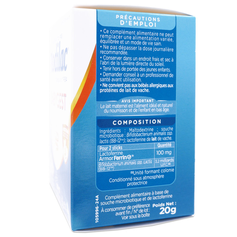 Les sticks contiennent des souches microbiotiques BB-12 TM et de la Lactoferrine, deuxième protéine du lait maternel. Les souches microbiotiques BB-12 TM contribuent au maintien d'une flore intestinale normale, tandis que la Lactoferrine renforce l'efficacité de la formule. Avec une présentation en poudre au goût neutre, ce produit est facile à intégrer au quotidien.