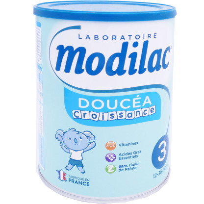 MODILAC est une marque de lait infantile crée en 1984 par le laboratoire SODILAC, spécialement conçue pour offrir un large choix de laits s’approchant au mieux du lait maternel, et répondre aux différents besoins nutritionnels des nourrissons pour accompagner leur croissance de façon harmonieuse. Le lait en poudre Doucea 3 Croissance de MODILAC Expert est formulé pour apporter tous les éléments nutritionnels essentiels au développement des bébés. Il est composé d’acides gras essentiels (Oméga 3), d’une teneur ajustée en protéines, de fer (24 fois plus que dans le lait de vache), de vitamines (A, C et D) et de zinc qui assure le développement normal de la croissance des tissus, le fonctionnement normal du système immunitaire et le développement du système nerveux sans surcharger l’organisme fragile des tout-petits. Sans huile de palme