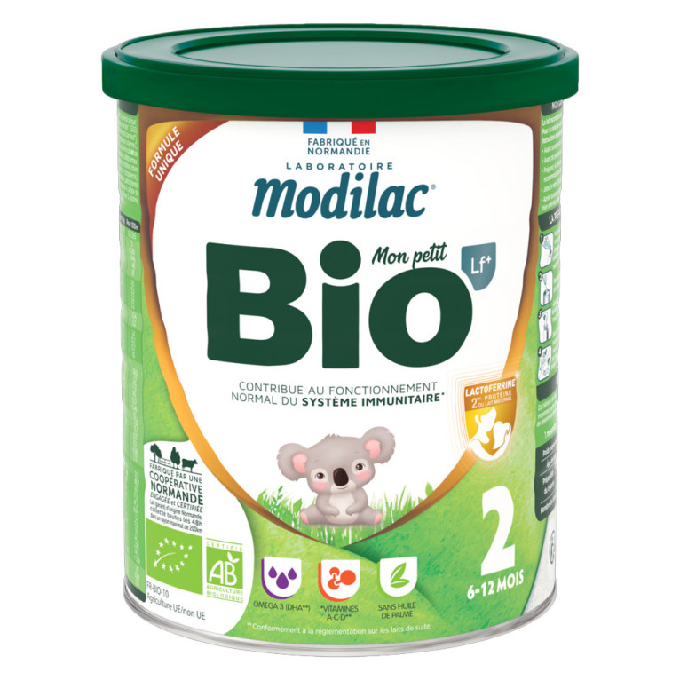Il contient du DHA, un acide gras oméga-3 qui contribue au développement normal du cerveau et des yeux. Enrichi en vitamines A, et C, ce lait biologique participe au soutien du système immunitaire, tandis que la vitamine D participe au développement normal des os. Ce lait est enrichi en lactoferrine, une protéine que l'on trouve en grande quantité dans le lait maternel. Grâce à notre expertise avancée, nous avons réussi à l'extraire du lait de vache d'origine française tout en préservant ses propriétés naturelles. Ce savoir-faire nous a permis de créer la formule exclusive du lait Modilac Bio Lf+2, afin de se rapprocher au maximum du lait maternel. De plus, il est formulé sans huile de palme, offrant ainsi une option de qualité pour l'alimentation de votre petit.