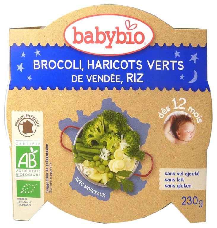 Les assiettes menus Bonne nuit pour bébé de BABYBIO sont de savoureux légumes et féculents avec morceaux 100% bio cuits à la vapeur pour les bébés dès 12 mois pour faire découvrir de nouvelles saveurs. L’Assiette Menu Brocoli Haricots verts Riz est idéale pour le repas du soir. Ce délicieux repas va faire découvrir aux bébés dès 12 mois les saveurs des brocolis et haricots verts du Val de Loire avec du riz. Cette assiette menu adaptée ravira les papilles des bébés! Sans sel ajoutés, sans lait, sans épaississant, sans conservateur