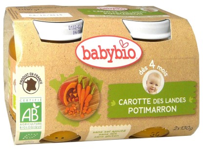 Les Petits pots Carotte-Potimarron de BABYBIO, un délicieux repas à donner aux tout-petits à partir de 4 mois pour commencer à diversifier leur alimentation tout en douceur.