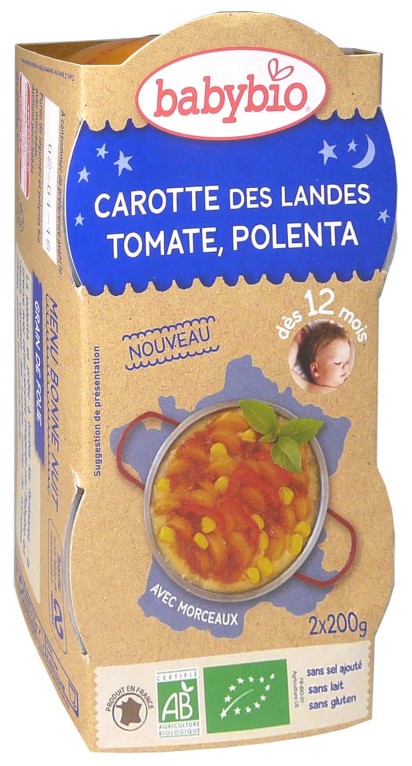 Les bols Bonne nuit pour bébé de BABYBIO sont de savoureux légumes et féculents avec morceaux 100% bio cuits à la vapeur pour les bébés dès 8 mois pour faire découvrir de nouvelles saveurs. Le Bol bonne nuit de carotte, tomate et polenta est idéale pour le repas du soir pour permettre aux bébés de passer une bonne nuit. Ce délicieux repas va faire découvrir aux bébés dès 12 mois les saveurs des carottes des Landes, la purée de tomates d’Italie et la polenta avec une pointe de basilic. Ce Bol bonne nuit adapté ravira les papilles des bébés! Sans sel ajoutés, sans gluten, sans lait, sans épaississant.