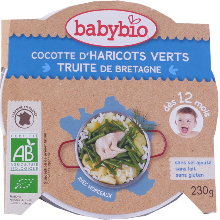 L’Assiette Cocotte d’haricots verts du Val de Loire & truite de BABYBIO, un délicieux repas à donner aux tout-petits à partir de 12 mois pour apprendre à manger tout seul.