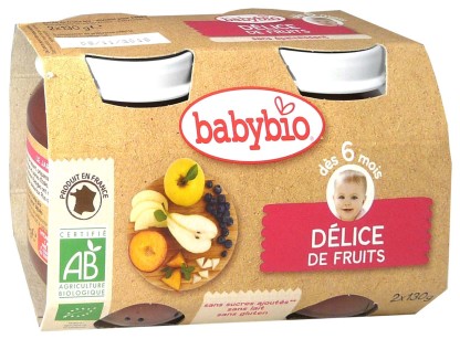 Les petits pots aux fruits de BABYBIO sont de délicieux desserts ou goûters pour les bébés dès 4 mois à base de savoureux fruits biologiques sans ajout de sucres. Dès 4 mois, la diversification alimentaire se fait tout en douceur en alternant avec les biberons de lait. Les Petits pots Délices de fruits une délicieuse purée de fruits inspirée de la salade de fruits juteuse et colorée (pomme d’Aquitaine, poires et pêches d’Italie, myrtille,…) vont faire découvrir aux bébés à partir de 4 mois, de nouvelles saveurs pour une diversification alimentaire en douceur. Ces petits pots adaptés raviront les papilles des bébés! Sans sucres ajoutés, sans lait, sans gluten, sans épaississant