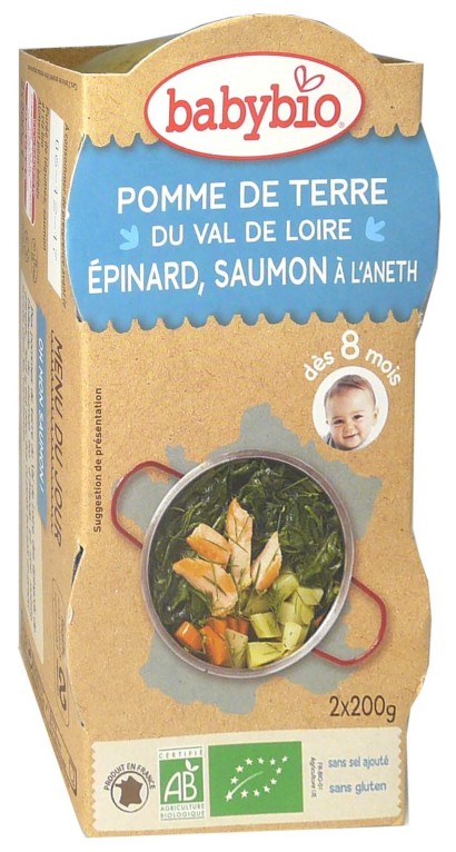 Les bols Menu du Jour pour bébé de BABYBIO sont de savoureux légumes et féculents accompagnés de poissons ou de viandes 100% bio cuits à la vapeur pour les bébés dès 8 mois pour faire découvrir de nouvelles saveurs. Le Bol Menu du jour va faire découvrir aux bébés dès 8 mois les saveurs de la pomme de terre du Val de Loire, des épinards de Hollande et les saveurs qui sont complétées par du saumon bio d’Irlande sur avec une pointe d’aneth et de crème fraîche entière. Ce bol menu du jour adapté ravira les papilles des bébés! Sans sel ajoutés, sans gluten