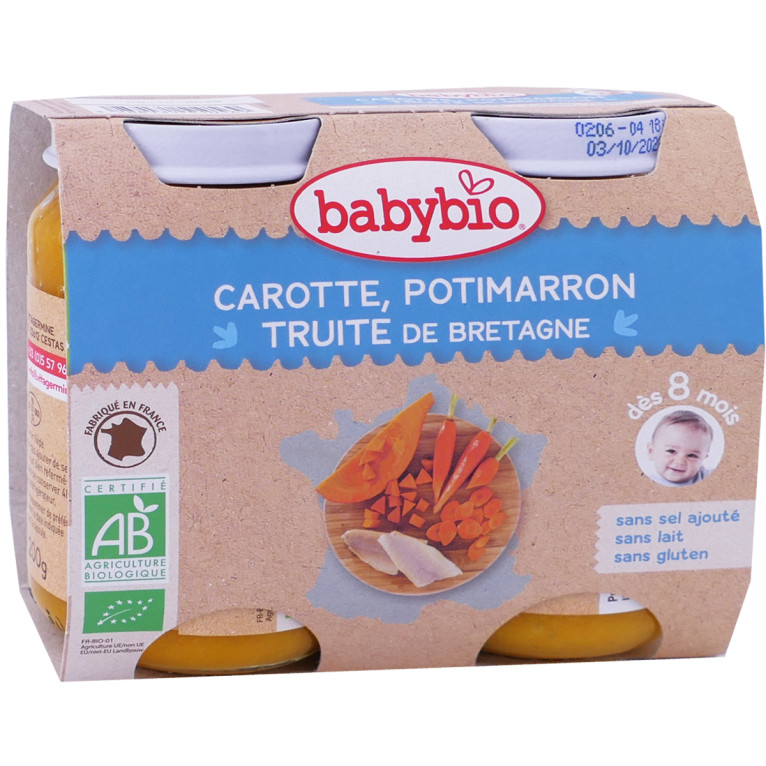 Les Petits pots Menu du Jour pour bébé de BABYBIO sont de savoureux légumes et féculents accompagnés de poissons ou de viandes 100% bio cuits à la vapeur pour les bébés dès 6 mois pour faire découvrir de nouvelles saveurs. Dès 4 mois, la diversification alimentaire se fait tout en douceur en alternant avec les biberons de lait. Les Petits pots Menu du jour Carotte Carotte Potimarron Truite cuits à la vapeur pour préserver leur goût naturels vont faire découvrir aux bébés dès 8 mois l’onctuosité des carottes des landes mélangées à du potimarron de la Drôme, qui sont complétées par de la truite de Bretagne, pour une diversification alimentaire en douceur. Ce Menu du jour en petit pot adapté ravira les papilles des bébés! Sans sel ajoutés, sans épaississant, sans lait, sans gluten.