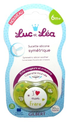 La sucette Luc et Léa « J'aime mon frère» apaise et rassure les bébés à partir de 6 mois tout en respectant le développement de la bouche.