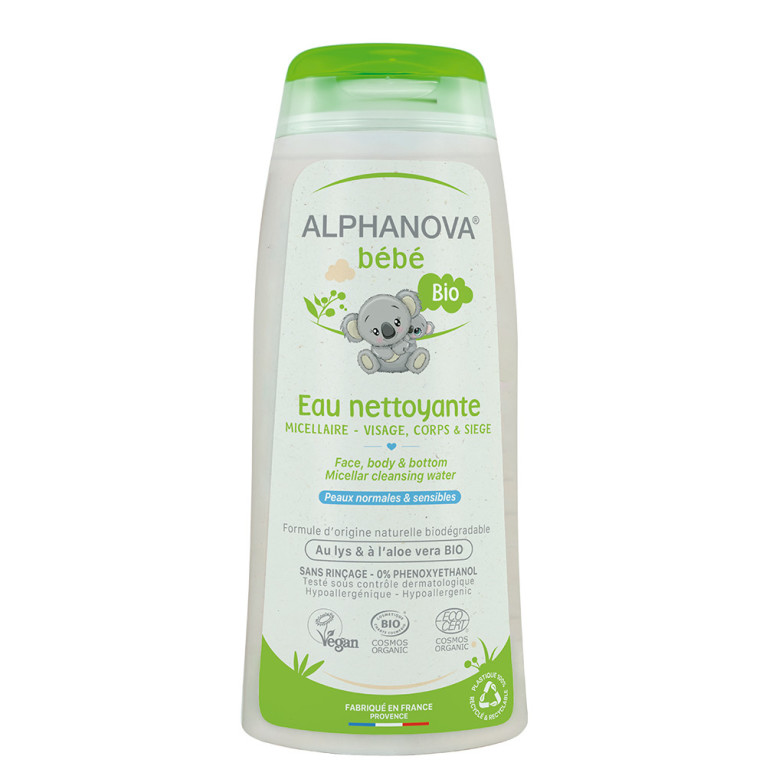 Eau nettoyante d'ALPHANOVA dans votre parapharmacie en ligne à prix discount, l'eau qui nettoie tout en douceur les peaux sèches et très sensibles le visage, le corps et le siège des bébés.