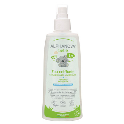 L’eau coiffante bébé d’ALPHANOVA, le soin frais et délicat pour la peau et les cheveux de bébé.