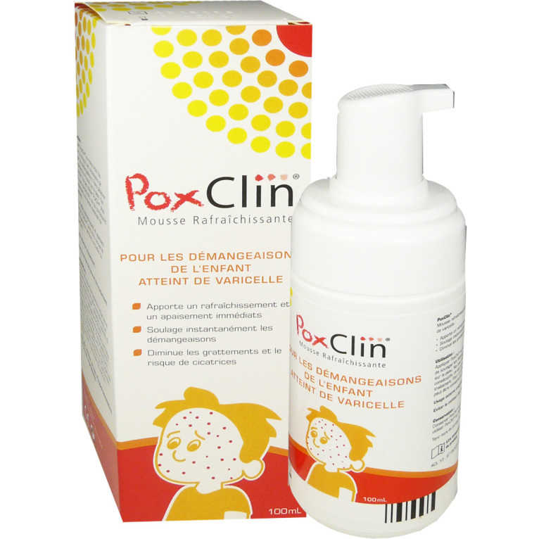 Mousse rafraîchissante de PoxClin, le dispositif médical pour cicatriser les boutons et apaiser les démangeaisons lors de varicelle chez les enfants.