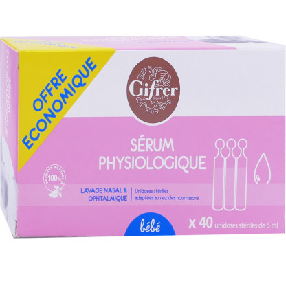 Sérum physiologique Bébé de GIFRER à prix discount dans votre parapharmacie en ligne, la santé au quotidien dans un dispositif médical en unidose pour laver le nez de bébé et ses paupières. Peut être utilisé chez toute la famille.