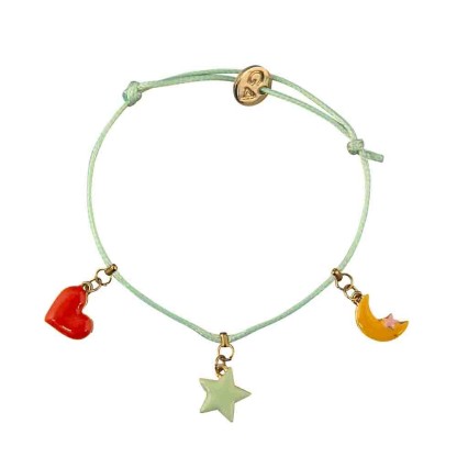 Le Bracelet Cœur Etoile Lune plaira aux enfants par ce joli bracelet doux en polyester accompagné de 3 petits charmes : cœur, étoile et lune, pour déclarer son amour !