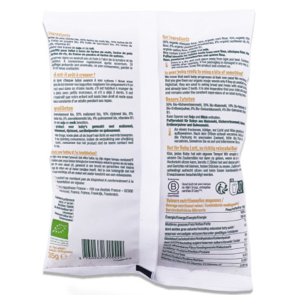Ingrédients : 56% farine de maïs bio, 16% farine de riz bio, huile de tournesol bio, 10% betterave en poudre bio, farine de petits pois bio, vitamine B1.Valeurs nutritionnelles : Energie - 394 kcal (1656 KJ)Matières grasses - 11 g (Dont acides gras saturés 1 g)Glucides - 59 g (Dont sucres 4.4 g)Fibres alimentaires - 6,2 g Protéines - 12 g Sel - 0.01 g Sodium - 0.008 g Vitamine B1 - 0.98 mg