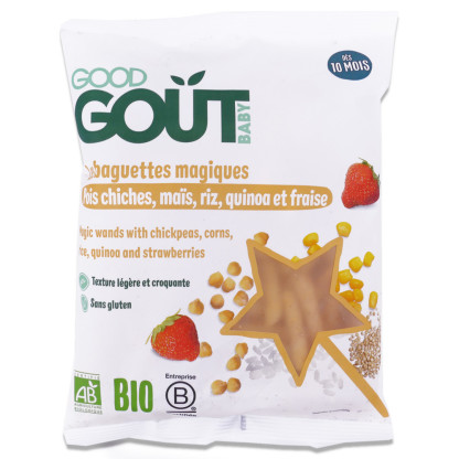 GOOD GOUT, une marque reconnue pour ses produits biologiques de qualité, propose ces baguettes magiques fabriquées à partir de farine bio de pois chiches, de maïs, de riz et de quinoa, ingrédients soigneusement sélectionnés pour leur apport en nutriments essentiels. Ces ingrédients contribuent à une alimentation équilibrée et sont adaptés aux besoins des tout-petits, tout en étant exempts de gluten pour convenir aux régimes spécifiques.