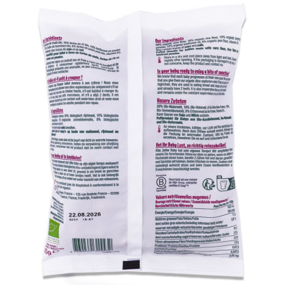 Ingrédients : 56% farine de maïs bio, 16% farine de riz bio, huile de tournesol bio, 10% betterave en poudre bio, 8% farine de petits pois bio, vitamine B1. Peut contenir des traces de SOJA et de LAIT