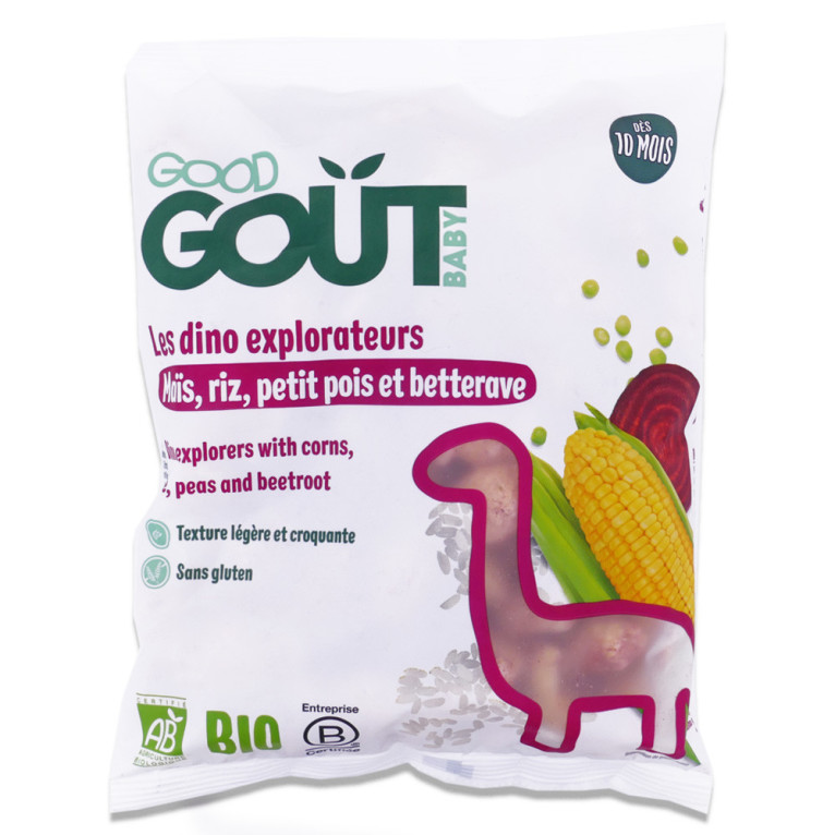 Good Goût, marque spécialisée dans l'alimentation infantile biologique, propose ce produit aux textures légères et croquantes, conçu sans huile de palme pour une consommation responsable. Les ingrédients actifs incluent des farines bio de maïs et de riz, des petits pois bio, de la betterave bio, et de la vitamine B1, qui contribuent au développement normal des enfants.