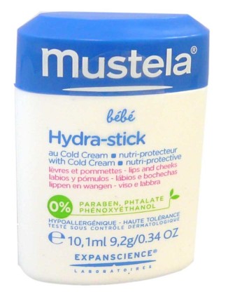 La gamme Bébé de MUSTELA est composée de produits à base d’ingrédients très doux d’origine naturelle hypoallergéniques, sans paraben, sans phtalate ni phenoxyethanol pour le plus grand respect des cheveux et de la peau fragiles des tout-petits dès la naissance. Hydra-Stick Bébé nourrit, protège et restructure en reformant et renforçant le film protecteur de l’épiderme fragile et en le restaurant, préserve la richesse cellulaire de la peau, hydrate et apaise de tout inconfort grâce sa richesse en beurre de karité, ainsi qu’à son complexe nutri-protecteur à base de Cold Cream et de céramides (lipides clés de la peau). Sa formule haute tolérance et hypoallergénique permet de ne pas irriter la peau ni la dessécher. Pratique son format en stick permet d’être emporté partout pour protéger et apaiser la peau de bébé rapidement et en toute circonstance. Après l’application, la peau de bébé est souple et retrouve tout son confort.