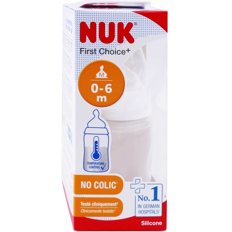 Les biberons NUK répondent de la meilleure façon aux besoins des bébés, ils accompagnent harmonieusement leur développement pour une transition du sein au biberon en douceur. Ils sont dotés d’une tétine physiologique en silicone souple taille M (perçage moyen-fin pour le lait) ayant la forme d’un mamelon, conçue avec le système Air System® anti-colique, anti-régurgitation et anti-aérophagie. Ces biberons assurent une bonne prise en main par leur forme légèrement incurvée. Le col large facilite le remplissage et l’entretien. La base large permet une stabilité du biberon optimale. Innovant, ce biberon permet grâce à un thermomètre situé à sa surface, de contrôler la température de l’alimentation de bébé afin qu’il évite de se brûler. Lorsque la couleur du thermomètre bleu devient blanc, la nourriture est trop chaude. Sans Bisphénol A. Peut être utilisé avec tous les produits NUK First Choice.