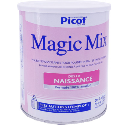Depuis 1896, PICOT développe des produits de nutrition infantile de haute qualité et propose des gammes complètes de laits infantiles, céréales instantanées, jus de fruits… issus d’un savoir-faire de tradition, pour participer à la croissance harmonieuse des bébés et assurer la tranquillité des mamans. La poudre MAGIC MIX est une poudre épaississante incolore, sans goût, qui ne gélifie pas, à base de 100% d’amidon (pomme de terre, maïs). Elle est à utiliser dans le lait ou toute autre boisson (chaude ou froide) pour faciliter la digestion au système digestif encore immature de bébé, ou faciliter le passage du bol alimentaire dans l’œsophage et réduire le risque de fausse route lors de reflux gastro-œsophagien. Sans gluten, sans lait