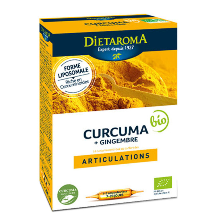DIETAROMA CURCUMA + GINGEMBRE ARTICULATIONS BIO 20 AMPOULES en vente en ligne sur le site de votre parapharmacie à prix discount, est un complément alimentaire destiné aux personnes pratiquant une activité sportive intense ou qui recherchent une solution naturelle lors de manque de flexibilité articulaire