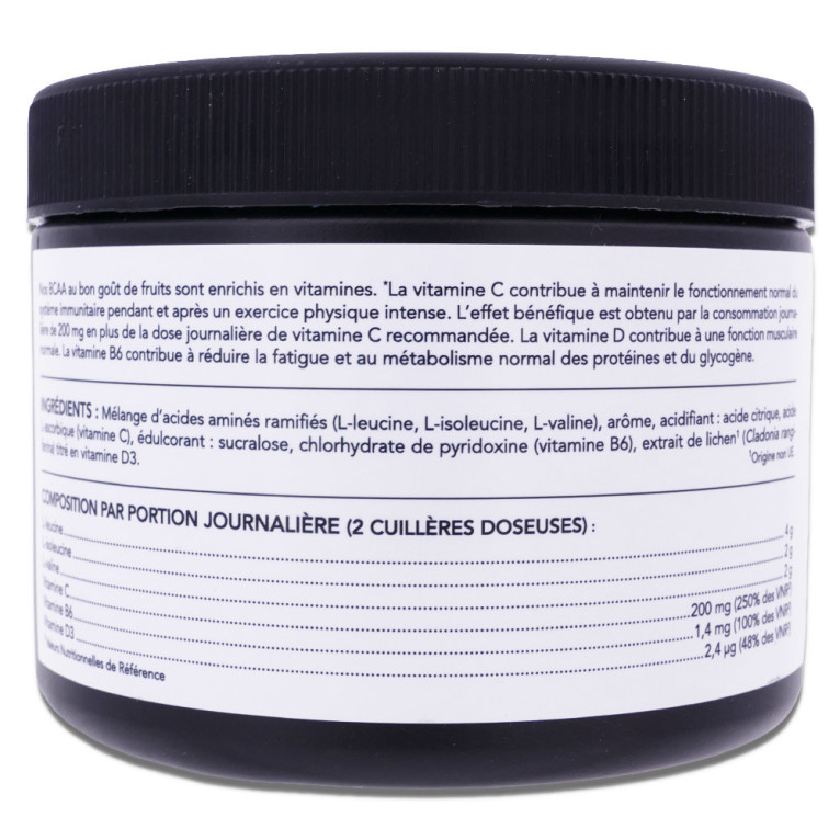 Ce produit contient des BCAA (acides aminés à chaîne ramifiée) dans un ratio de 2.1.1, essentiels pour l'énergie et le soutien musculaire lors d'efforts physiques intenses. Enrichi en vitamines B6, C et D, ce complément alimentaire contribue au métabolisme énergétique normal et aide à réduire la fatigue. Avec sa saveur agréable de pêche, ce produit est idéal pour accompagner vos séances d'entraînement.