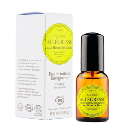 Le laboratoire FLEURS DE BACH conçoit des élixirs et parfums à base de végétaux naturels pour améliorer le bien être, retrouver un bon équilibre émotionnel et naturel. Les fleurs de Bach sont élaborées en respectant rigoureusement la méthode originale et l’esprit authentique du Docteur Bach.L’eau de toilette Allégresse permet en cas de désespoir, tristesse, abandon,…de retrouver le sourire, l’enthousiasme et de se retrouver léger par les essences naturelles de Centaurée, Charme, Chêne, Eglantine, d’Olivier.Son parfum pétillant et joyeux permettra de se sentir bien et plein d’énergie.