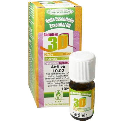 Complexe d’huile essentielle 3D Anti’Vir de PHYTOFRANCE, est un complément alimentaire à base d'huile essentielle de tea tree, qui aide aux défenses de l'organisme contre les agents extérieurs, et d'huile essentielle de ravintsare.