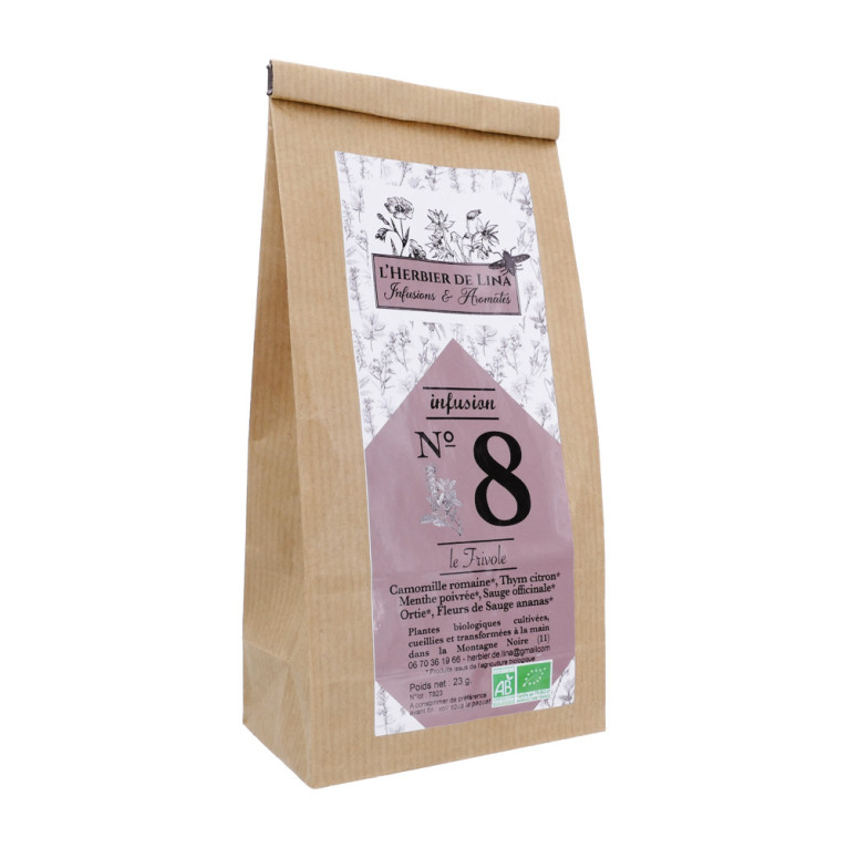 Offrez-vous une parenthèse de douceur et de sérénité avec L'HERBIER DE LINA INFUSION BIO N°8 LE FRIVOLE, et laissez-vous séduire par ses bienfaits apaisants.