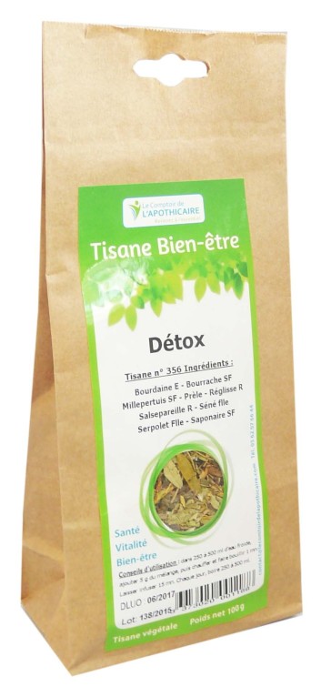 Le laboratoire LE COMPTOIR DE L’APOTHICAIRE propose des produits de phytothérapie et aromathérapie (compléments alimentaires, tisanes, cosmétiques) à base exclusivement de produits naturels traditionnels et bio pour le bien-être au quotidien. La tisane Detox du laboratoire Le comptoir de l’Apothicaire est une tisane à base de plantes naturelles (bourdane, bourrache, millepertuis, prêle, réglisse, salsepareille, séné, serpolet, saponaire) qui va drainer l’organisme en éliminant l’eau, les déchets et les toxines par les voies urinaires, et participer au bon fonctionnement biliaire pour détoxifier l’organisme.