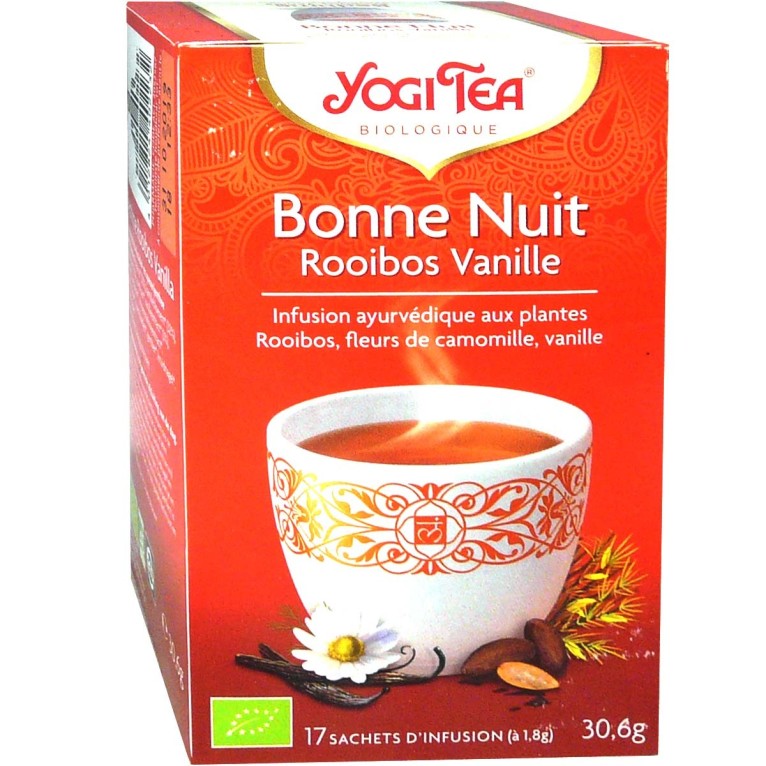 La marque YOGI TEA propose une gamme complète d’infusions délicieuses, composées d’ingrédients certifiés ’Agriculture Biologique,’ qui subissent des contrôles stricts afin de proposer un produit de grande qualité aux consommateurs les plus exigeants et répondre naturellement aux besoins de chacun : digestion, purification, nuit paisible, pour l’hiver, pour la Femme… YOGI TEA Bonne Nuit Rooibos Vanille est un assemblage parfait de plantes et épices au goût et à la saveur unique. Composée entre autres de vanille, écorce de cacao, clou de girofle et gingembre, cette infusion au goût délicat offre un pur moment de relaxation et favorise l’endormissement.