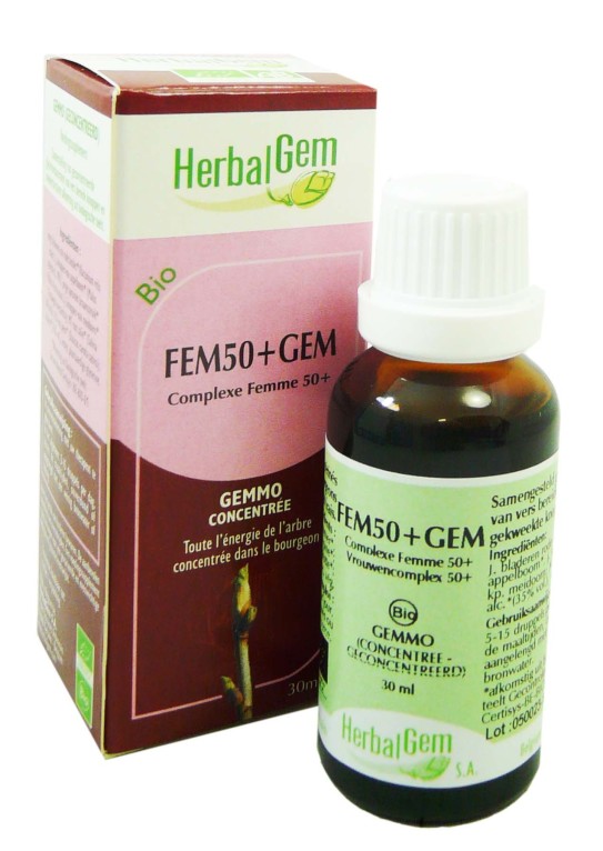 Fem50+ Gem Gemmo Concentré BIO Ménopause d’HERBALGEM, la gemmothérapie sous forme de complément alimentaire en gouttes buvables, dans votre parapharmacie en ligne à prix discount.