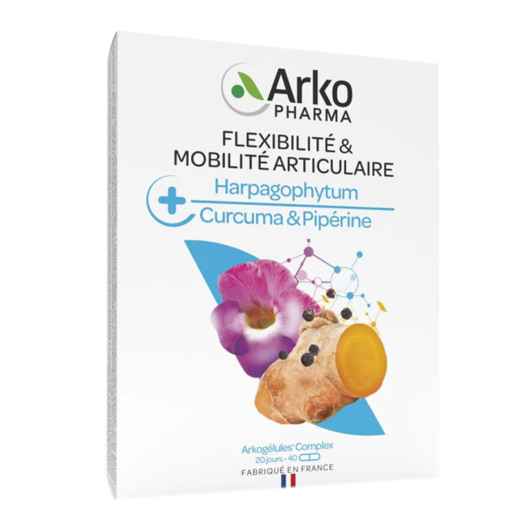 Arkogélules® Complex Flexibilité & Mobilité articulaire est un complément alimentaire d'origine biologique à base d’Harpagophytum associé au Curcuma et au Poivre noir.L'harpagophytum aide à maintenir la souplesse des articulations tandis que le curcuma participe au soulagement des douleurs inflammatoires, musculaires et articulaires.