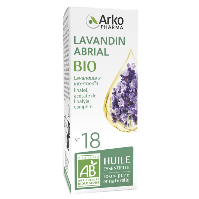 Lavandin abrial BIO N°18 huile essentielle 100 % pure et naturelle d'ARKOPHARMA est extraite des sommités fleuries de lavande issue d'un croisement naturel de la lavande fine et de la lavande aspic, elle fait partie de la famille des Lamiacées.Cette huile essentielle possède une odeur légèrement camphrée.