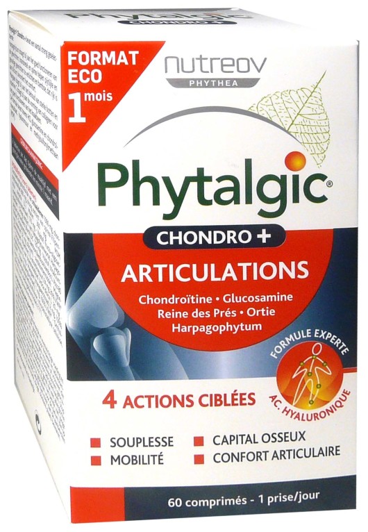 PHYTALGIC CHONDRO+ Articulations est un complément alimentaire conditionné sous forme de comprimés, formulé à base d’extrait de reine des près et d’ortie. Sa formule contient du sulfate de chondroïtine, du HCL glucosamine, du bambou, de la vitamine C associé à de l’harpagophytum et du manganèse. Le Bambou présent dans cette formule est une source de silice qui participe au confort articulaire et à la force de l'os. L'harpagophytum aide à maintenir la flexibilité des articulations ainsi qu'une bonne mobilité, la vitamine C aide à la formation normale de collagène pour assurer la fonction normale du cartilage et le cuivre contribue au maintien des tissus conjonctifs normaux (cartilage). Enfin le manganèse permet le maintien du capital osseux.