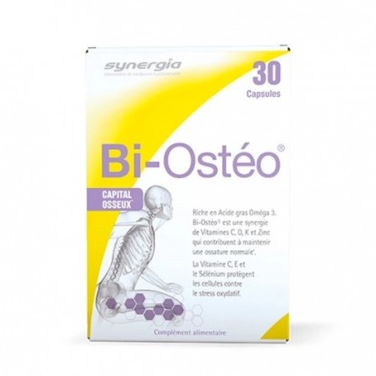 SYNERGIA Bi-Ostéo Capital osseux est un complément alimentaire sous forme de capsules. Sa formule associe du zinc, du sélénium, des vitamines D, C et E ainsi que des oméga 3 (acides gras essentiels) qui complètent la formule. La vitamine C participe à la formation normale de collagène pour le fonctionnement normal des os, les vitamines D et K aident au maintien d'os normaux et le zinc contribue au maintien d'une ossature normale. Enfin les vitamines C et E associées au sélénium aident à protéger les cellules contre le stress oxydatif.