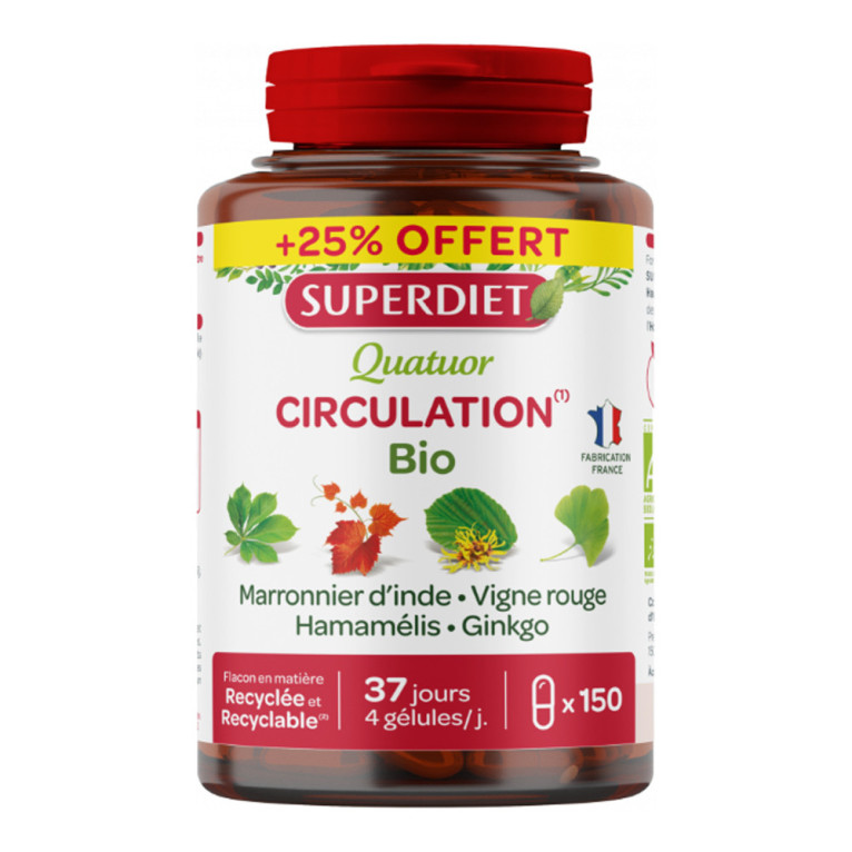 QUATUOR CIRCULATION des laboratoires SUPER DIET, est un complément alimentaire à base de marronnier d'inde et de vigne rouge, qui contribuent à une bonne circulation sanguine et une sensation de jambes légères. Du ginkgo et de l'hamamélis viennent s'ajouter à ce complément alimentaire