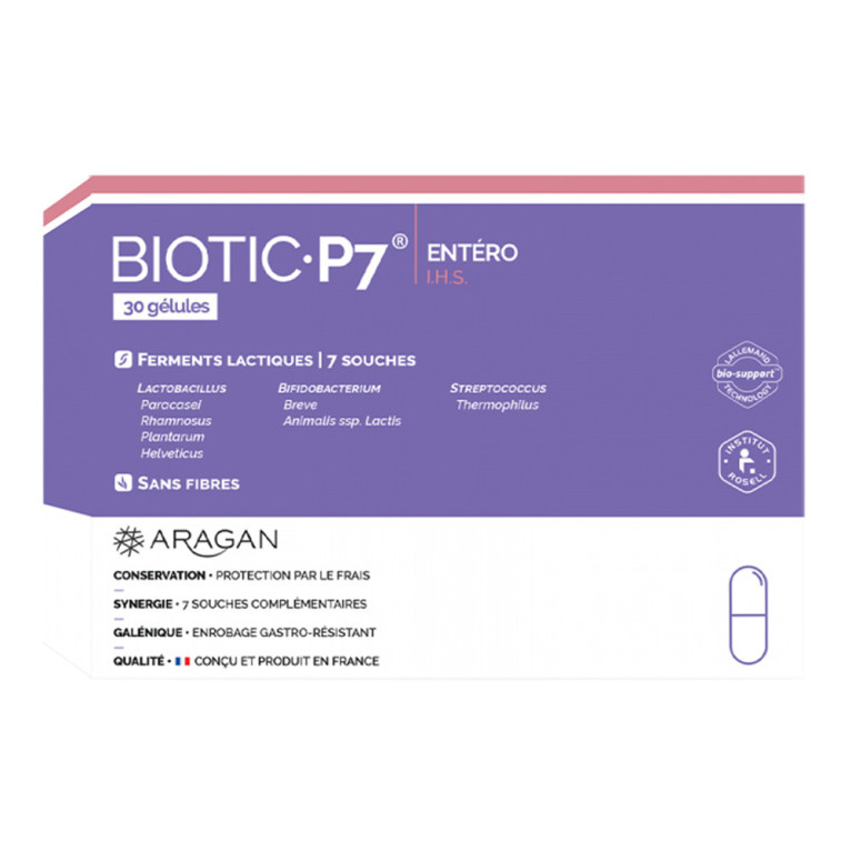 BIOPTIC P7 ENTERO des laboratoires ARAGAN, le complément alimentaire qui rééquilibre le transit intestinal chez les adultes ayant un transit intestinal sensible (ballonnement, transit difficile,…).