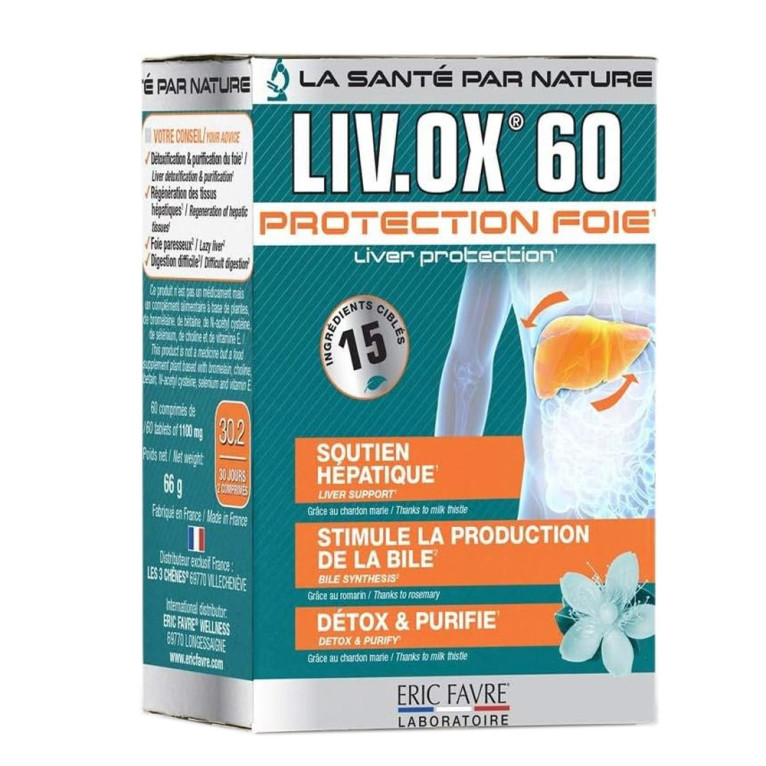 Liv.ox 60 assure une protection hépatique tout en détoxifiant et purifian le foie, il stimule également la production de la bile.