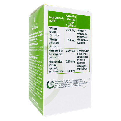 Extrait de vigne rouge1 (Vitis vinifera) (feuille) ; Extrait d’hamamélis de Virginie1 (Hamamelis virginiana) (feuille) ; Extrait de marronnier d'Inde1 (Aesculus hippocastanum) (graine) ; Extrait de mélilot officinal1 (Melilotus officinalis) (sommités fleuries) ; fibre de pomme1 ; enveloppe de gélule : hydroxypropylméthylcellulose. (1) Issu de l’Agriculture Biologique.