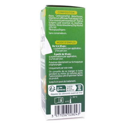 Aqua, Carboxymethyl Beta-Glucan, Sisymbrium officinale fluid extract 14%, Citrus sinensis peel essential oil*, Thymus Vulgaris Leaf essential oil, Anethole, Glycerin, Stevia rebaudiana, Ethyl Alcohol 20% Vol. *Biologique/Organic .