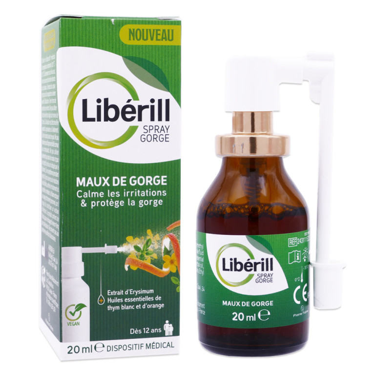 LIBÉRILL SPRAY MAUX DE GORGE 20ML est un dispositif médical innovant, en vente en ligne sur le site de votre parapharmacie à prix discount, conçu pour apaiser les irritations de la gorge. Profitez de ses propriétés en toute simplicité !