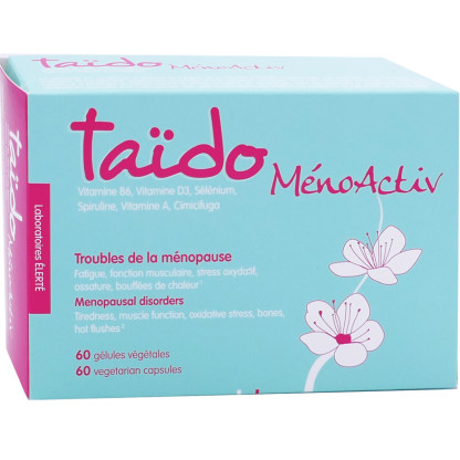 Le complément alimentaire TAÏDO menoactiv est composé d’ingrédients 100% naturel. Sa formule associe des vitamines B6 et D3 du Sélénium, de la Spiruline et de la Cimicifuga.