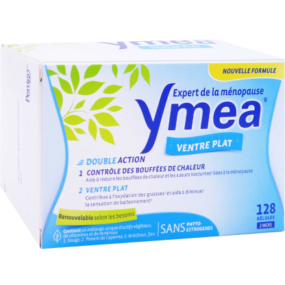 La gamme YMEA propose des compléments alimentaires formulés avec des actifs végétaux, des vitamines et des oligo-éléments. YMEA ménopause Ventre Plat est un complément alimentaire conditionné sous forme de gélules composé de thé vert, de piment de Cayenne, de vitamines B6 et D3, du zinc, de l'artichaut et de la sauge. Dans cette formule la sauge aide à soulager les bouffées de chaleur et les sueurs nocturnes, la vitamine B6 participe à la régulation de l'activité hormonale et la vitamine D contribue au maintien d'os normaux, d'une fonction musculaire normale et au fonctionnement normal du système immunitaire. Enfin le piment aide à stimuler l'oxydation des graisses et l'artichaut participe à la digestion.