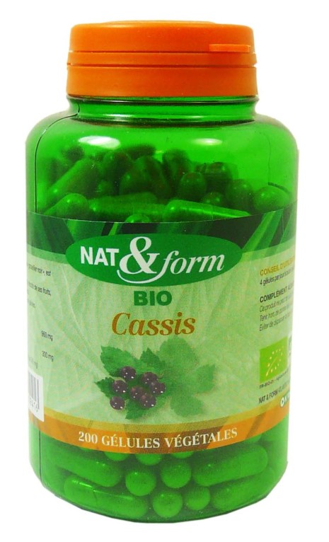 Cassis bio de Nat&Form est un complément alimentaire à base de cassis. Le cassis, petit fruit que l’on trouve sur des arbrisseaux originaires d’Europe Centrale, est extrêmement riche en tanin, vitamines P, B1, B2 et C, sels minéraux , calcium, fer, polyphénols, et flavonoïdes.Le cassis est utilisé pour faciliter les fonctions d'élimination de l'organisme, soulage les douleurs inflammatoires.