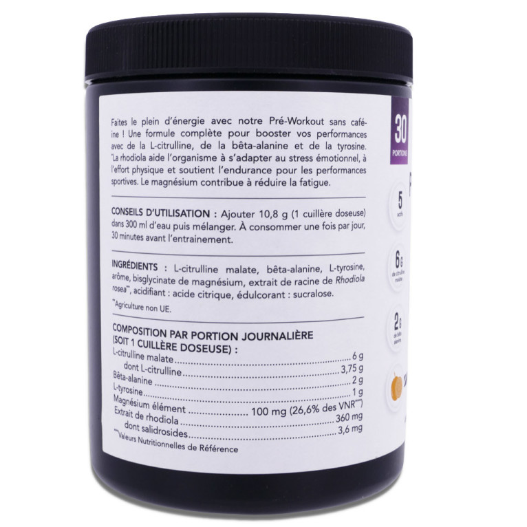 Ce complément alimentaire fait partie de la gamme NAT&FORM, reconnue pour ses formulations adaptées aux besoins des sportifs. La L-citrulline est un acide aminé qui soutient la performance physique en participant à la production d'oxyde nitrique. La bêta-alanine contribue à réduire la sensation de fatigue musculaire lors d'exercices intenses. La tyrosine, un autre acide aminé, participe au maintien de la concentration mentale. La rhodiola est une plante adaptogène qui aide l'organisme à s'adapter au stress physique et mental. Le magnésium soutient la fonction musculaire et réduit la fatigue. Sans caféine, ce booster saveur passion est idéal pour ceux qui recherchent une alternative naturelle.
